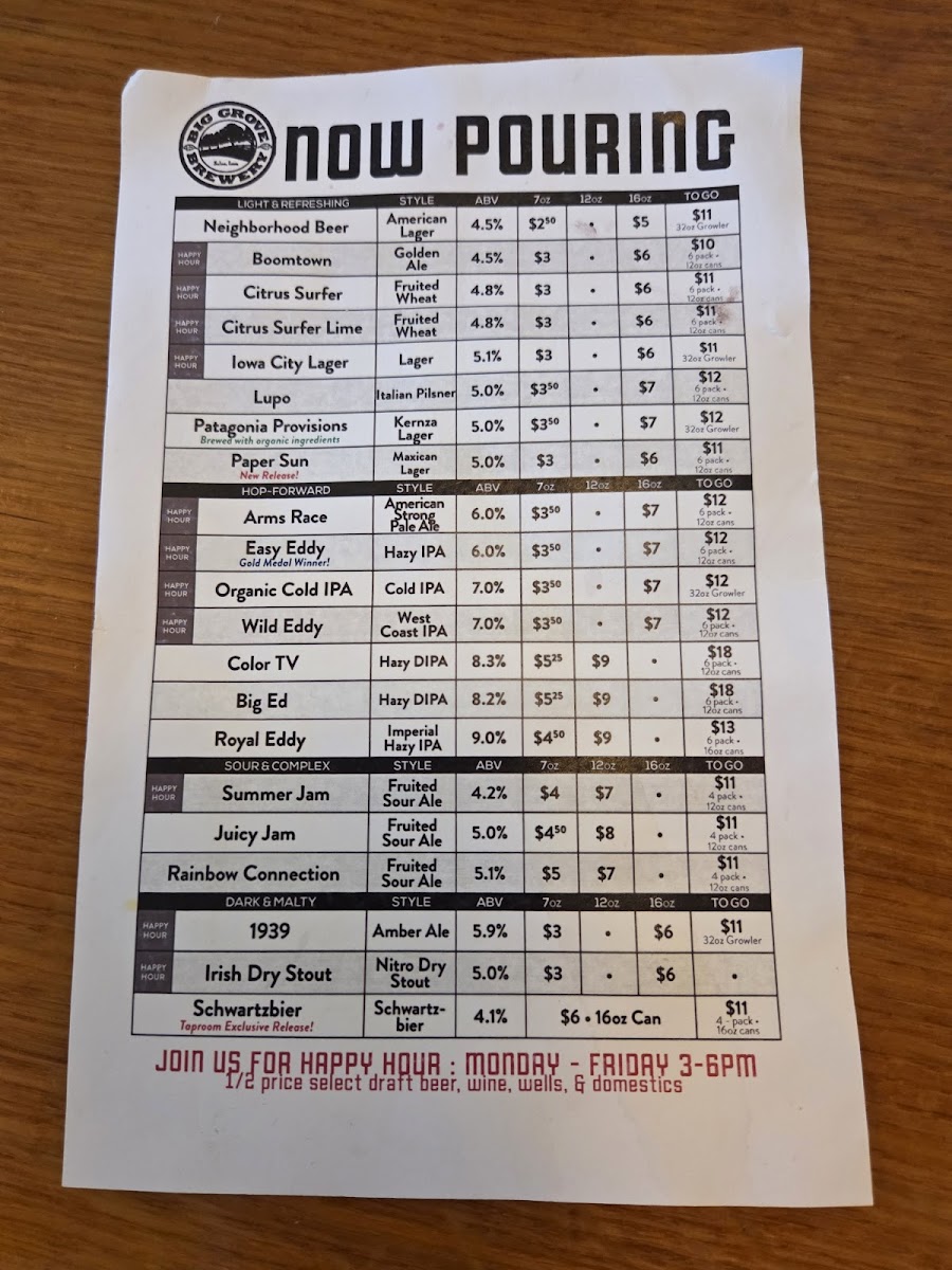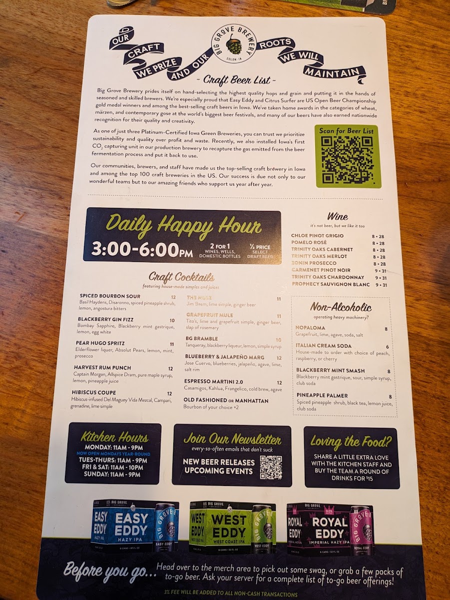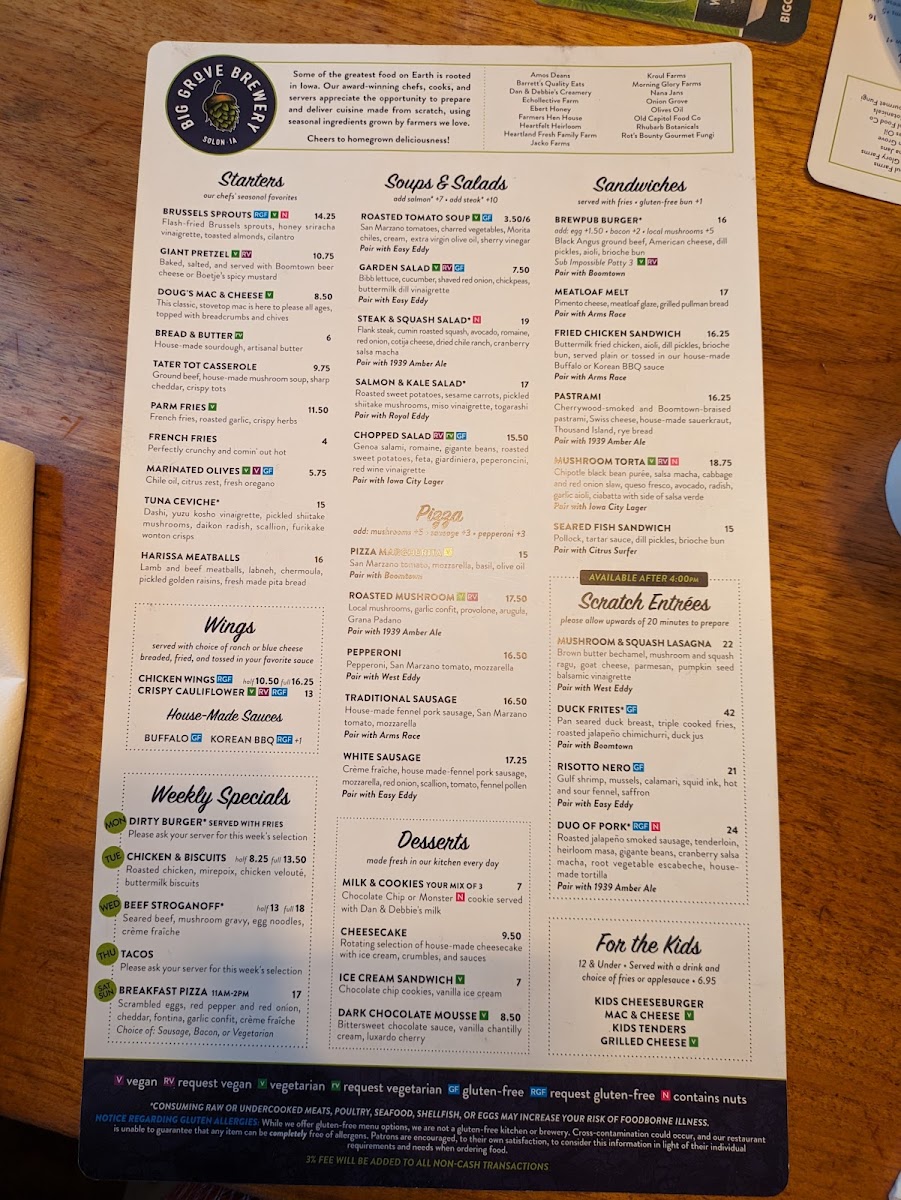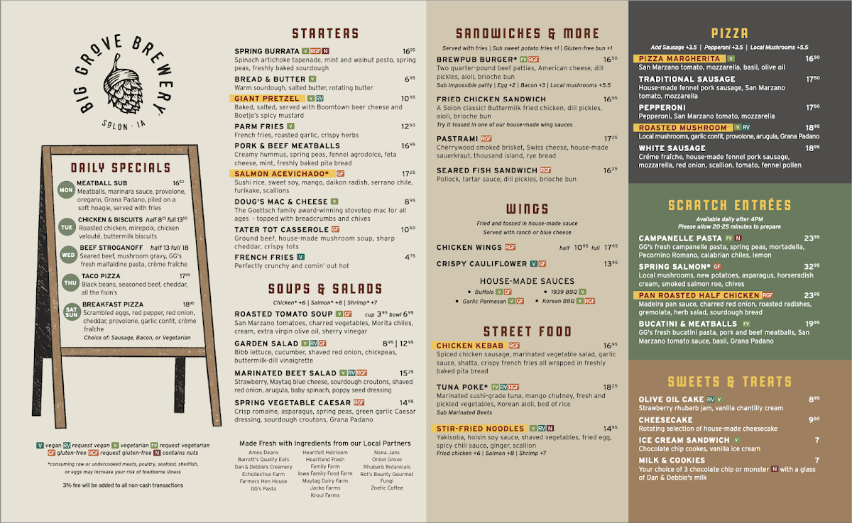 Welcome to Big Grove Brewpub-Solon, a hidden gem nestled in the heart of Solon, Iowa. This inviting establishment offers a thoughtfully curated menu that showcases a blend of hearty, comforting dishes and innovative flavors. Among the highlights, you'll find their Monday Meatball Sub—savor tender meatballs draped in marinara and provolone, served on a soft hoagie, perfect for lunch or dinner. On Tuesdays, indulge in the Half Chicken & Biscuits, a delightful combination of roasted chicken and buttery biscuits for just $8.25.